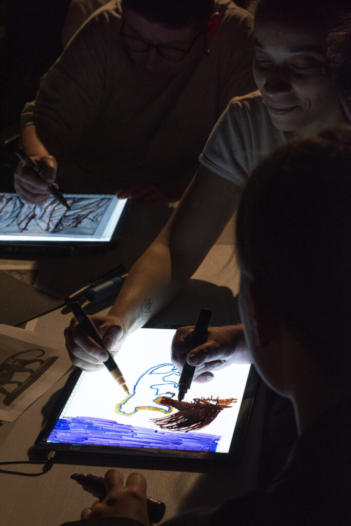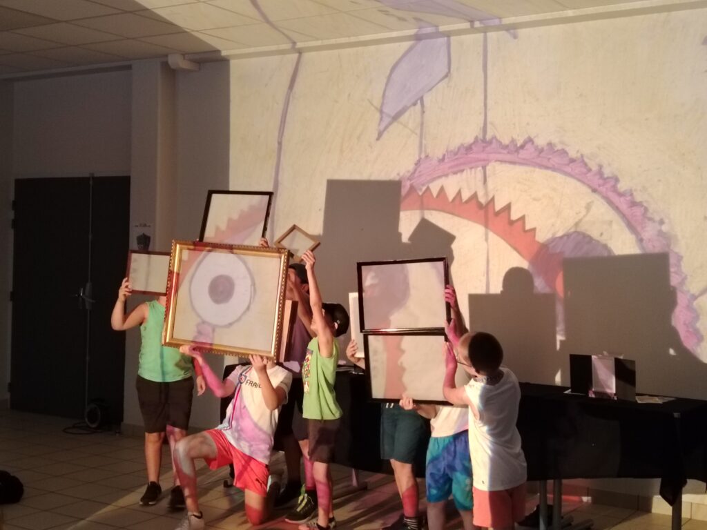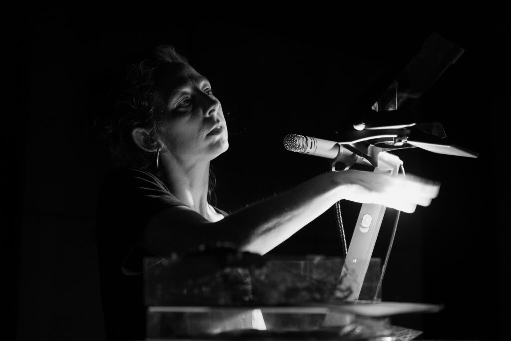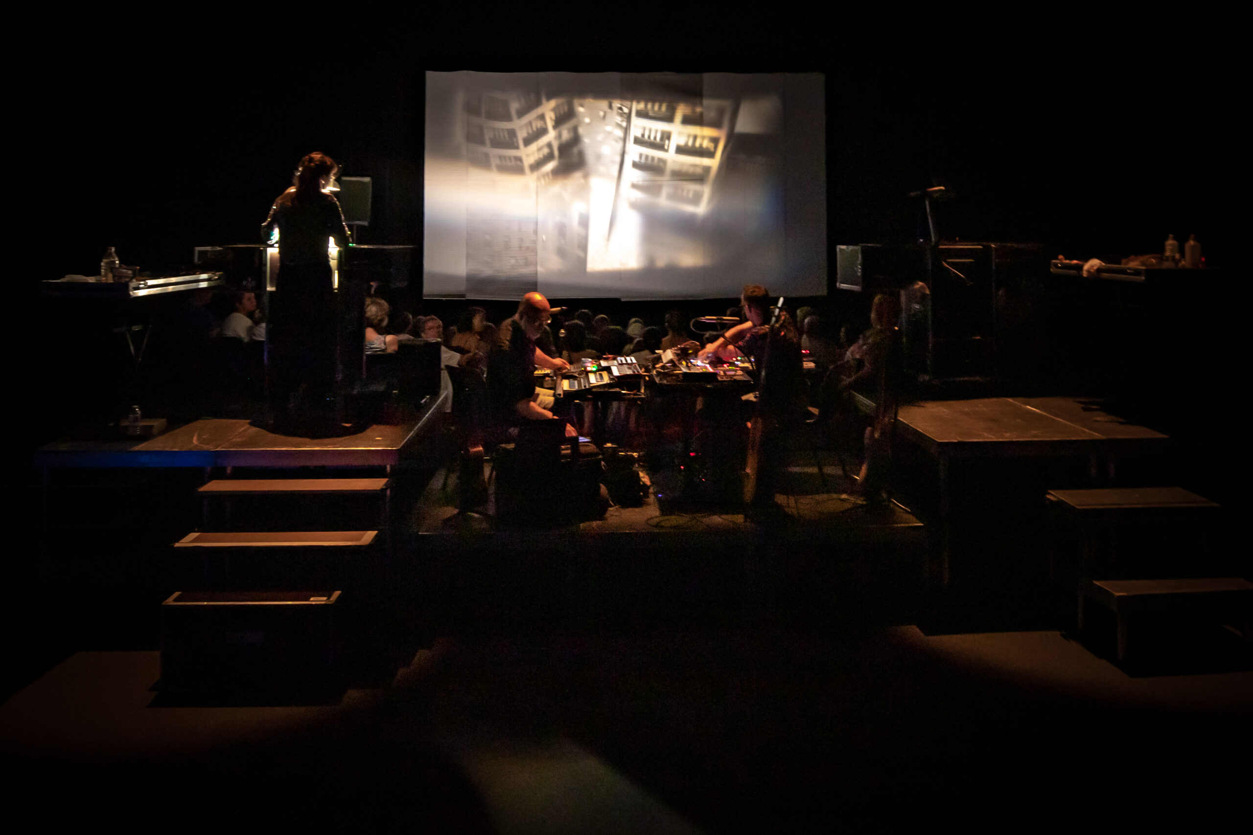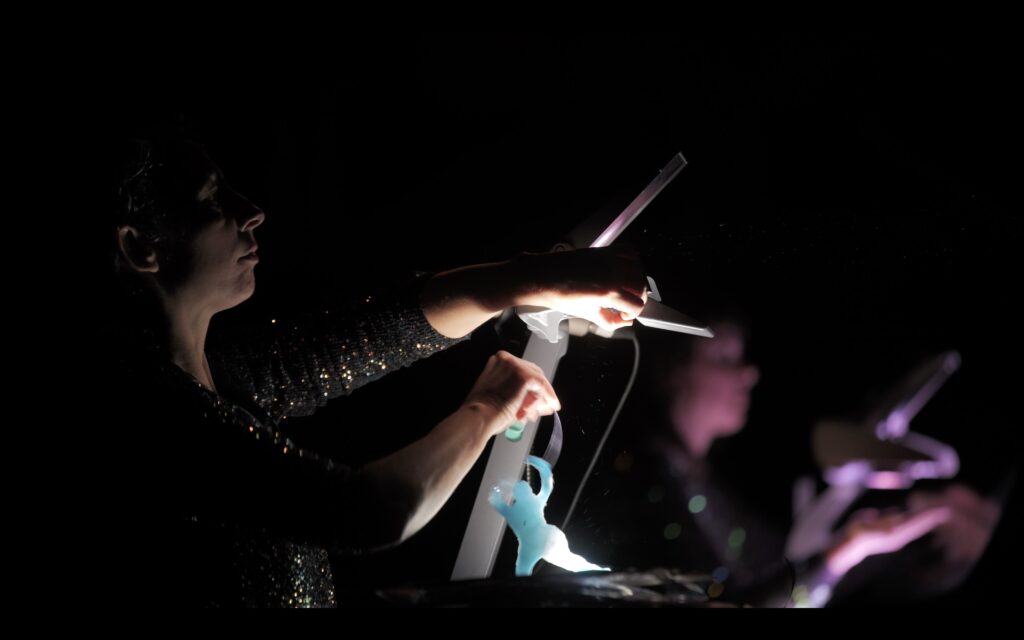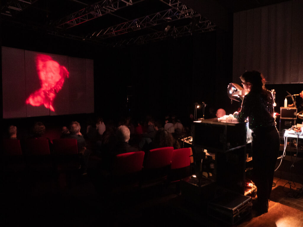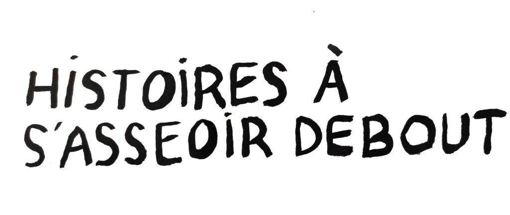 « Histoires à s’asseoir debout” est une performance visuelle et sonore, une fabrique d’images sonorisées et de sons imagés, projetés et animés en direct par 2 artistes pluridisciplinaires, et 2 musiciens multi-instrumentistes.