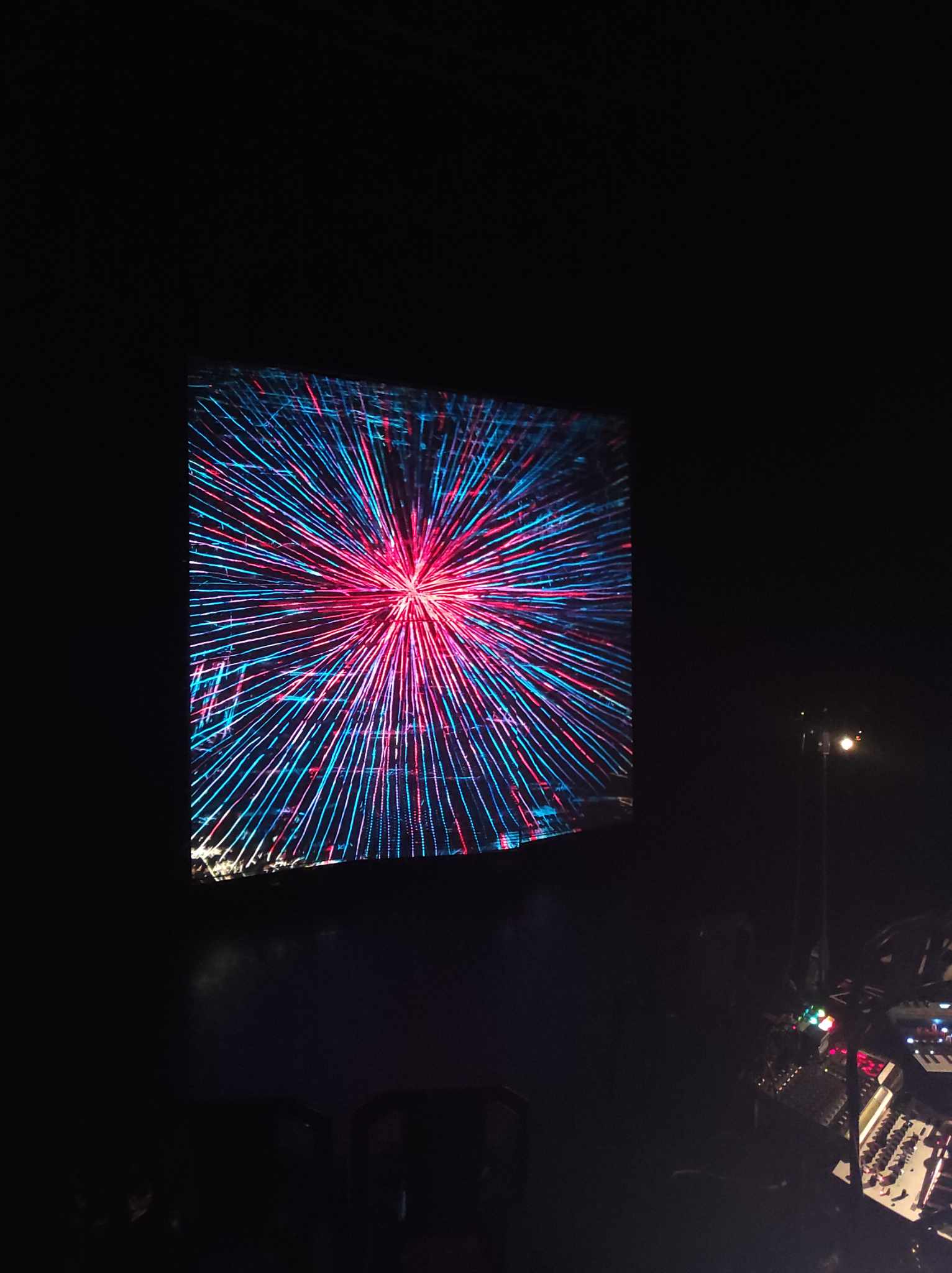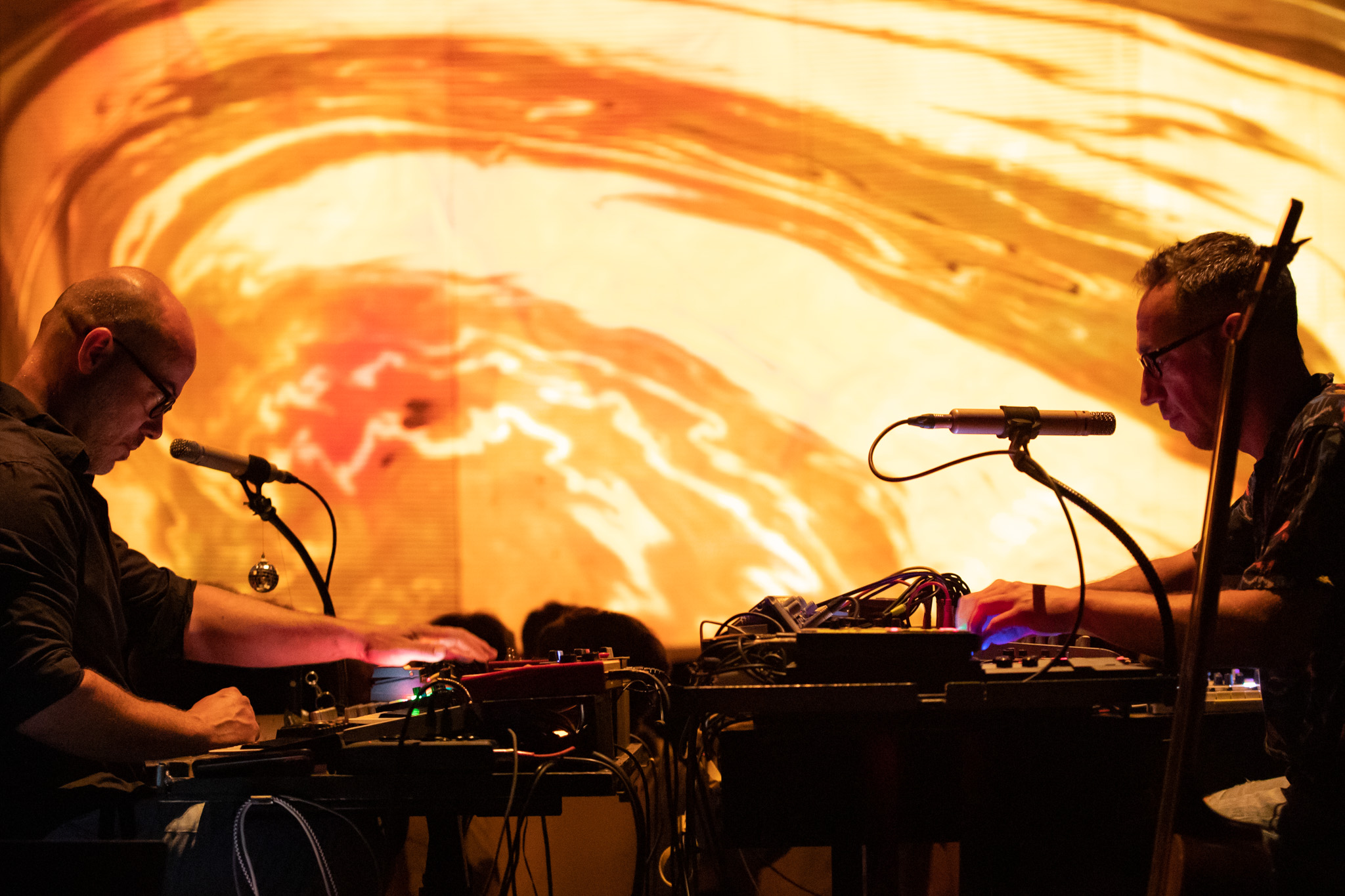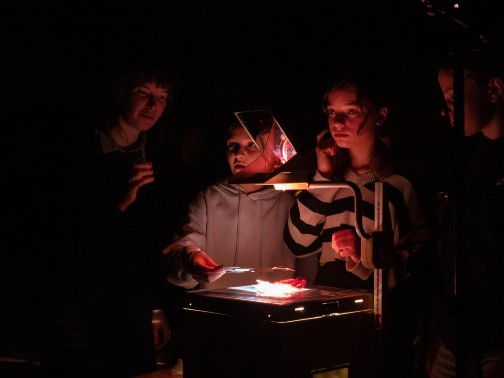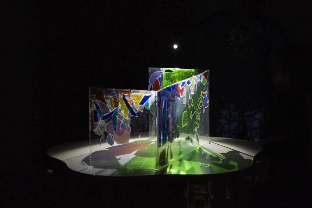 Nous invitons le public à voyager dans une fresque lumineuse, un vitrail fabriqué en direct, une bande dessinée vivante. Nous – explorateurs de l’image animée, de la lumière et du son – proposons une expérience synesthésique et sensorielle créée par des points de friction entre l’ouïe et la vue. Notre grand mécanisme légèrement aléatoire est créé comme un ensemble de fenêtres ouvertes sur différents points de vue, invitant le spectateur à balader son regard et se laisser immerger dans l’épaisseur de l’espace et du temps.