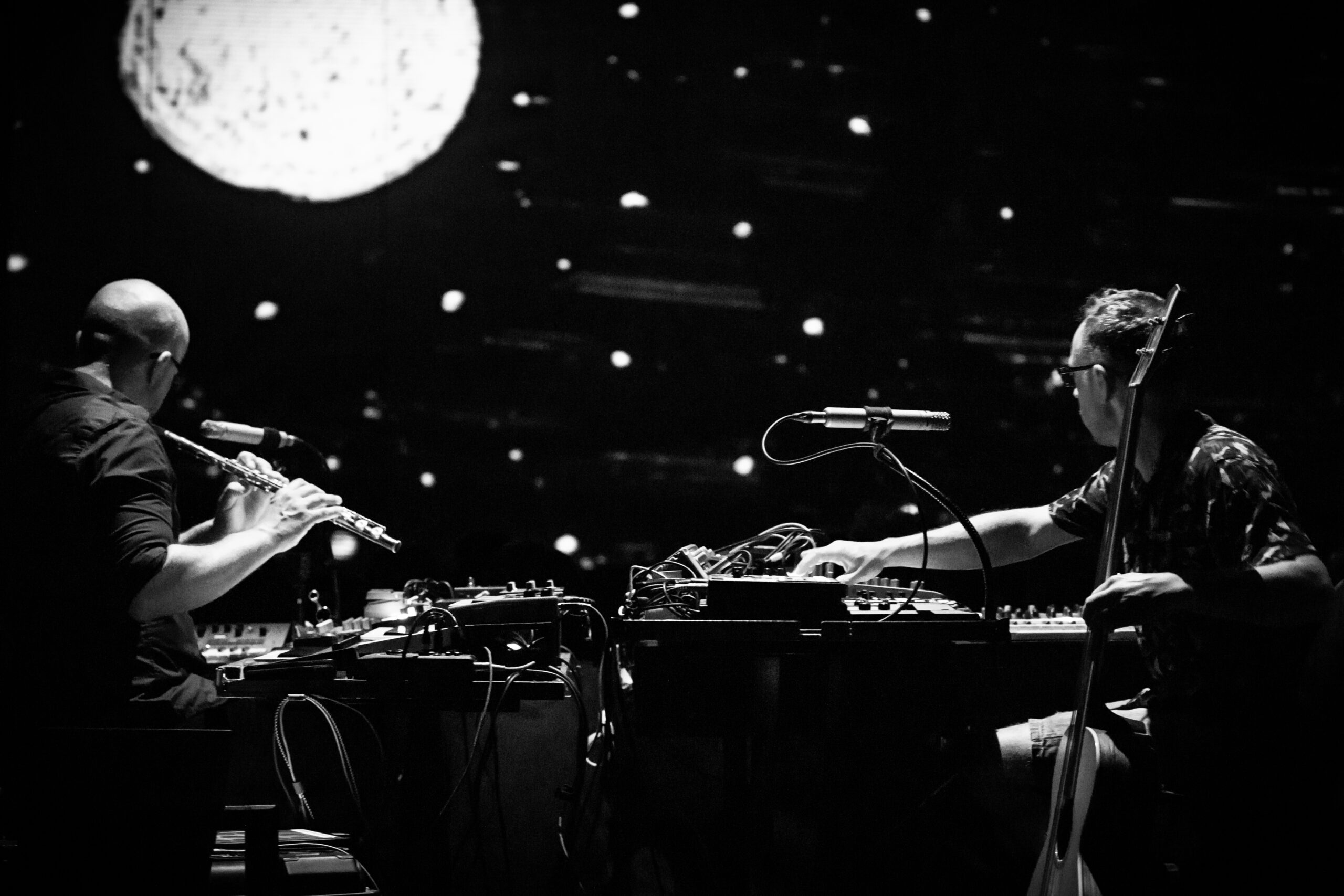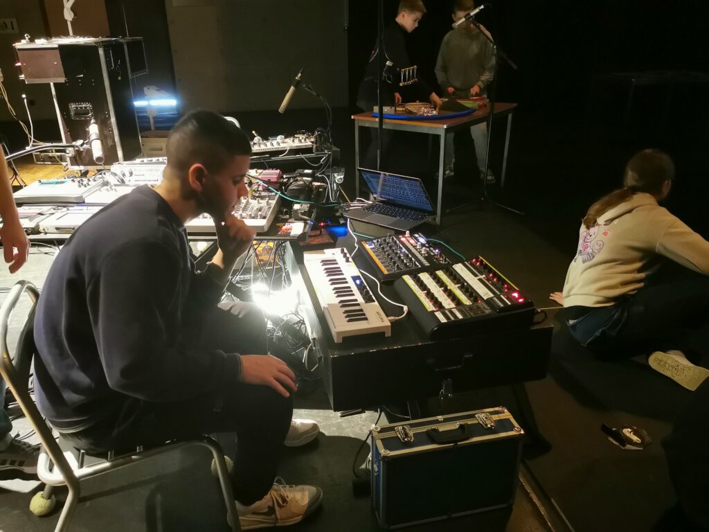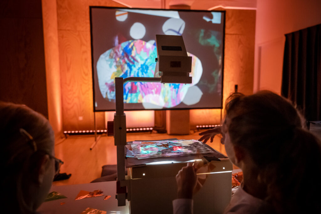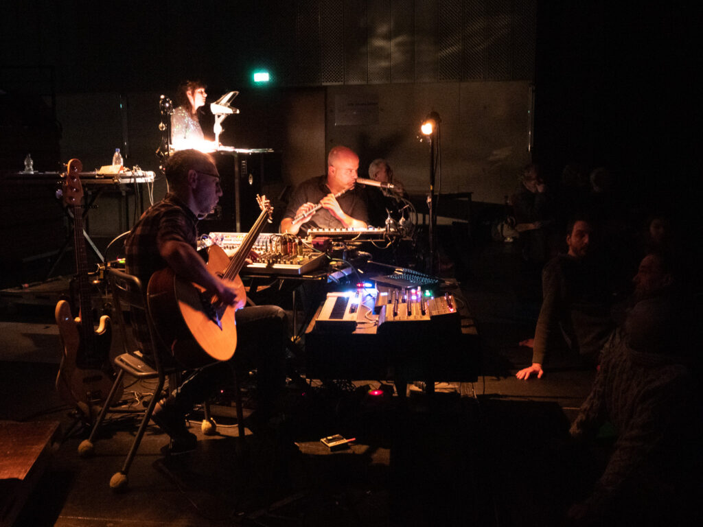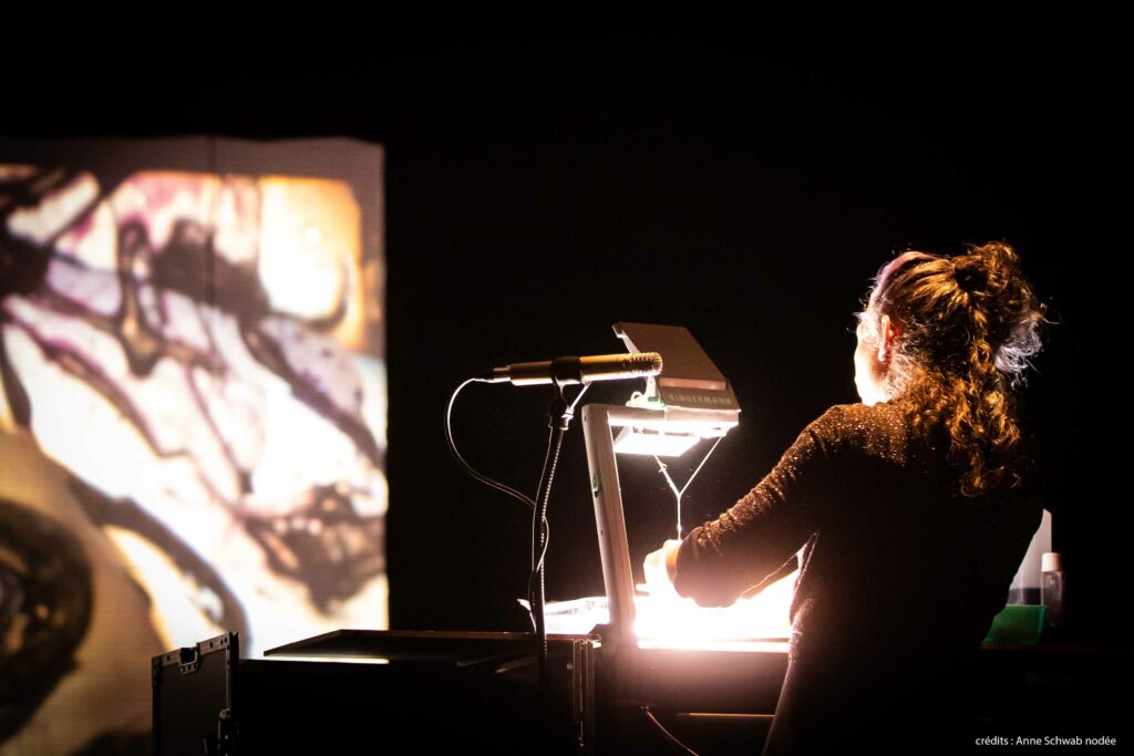 Nous hybridons nos univers à travers un jeu d’improvisations et de compositions, au croisement de la musique électro-acoustique, des arts plastiques, du théâtre d’ombres d’effets optiques et magiques. Le processus de création est central : le “fait main” et le “fabriqué en live” sont mis en avant par l’animation d’images textures, d’encres, d’objets, de matériaux insoupçonnés… sur des rétroprojecteurs. Les musiciens créent de la matière sonore , des superpositions grâce à des instruments électroniques ( synthétiseurs loopers, effets…) mais également des instruments acoustiques ( basse, flûtes, claviers, saxophones, percussions …)