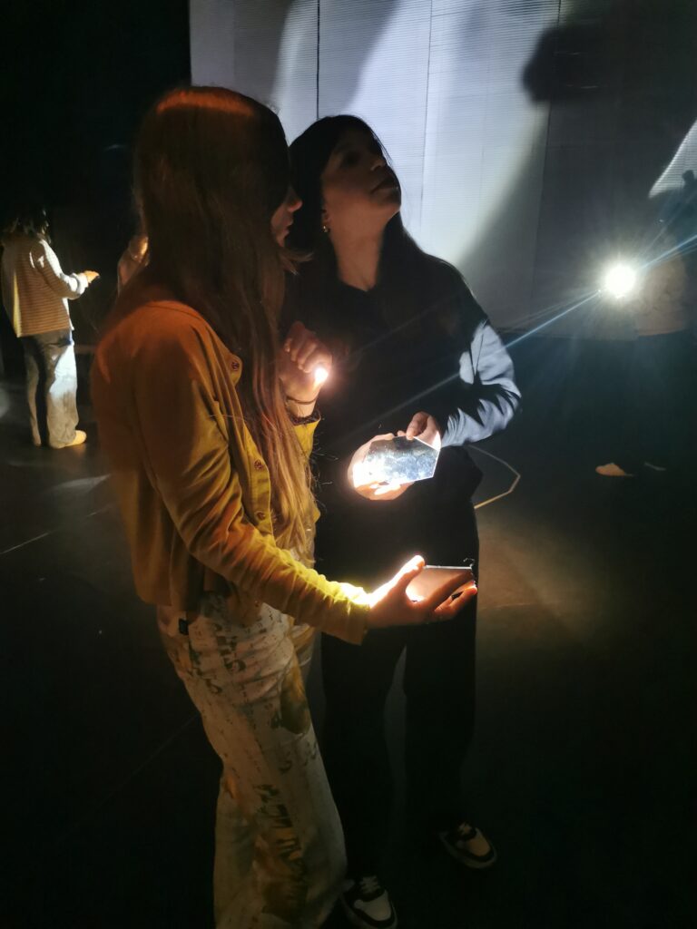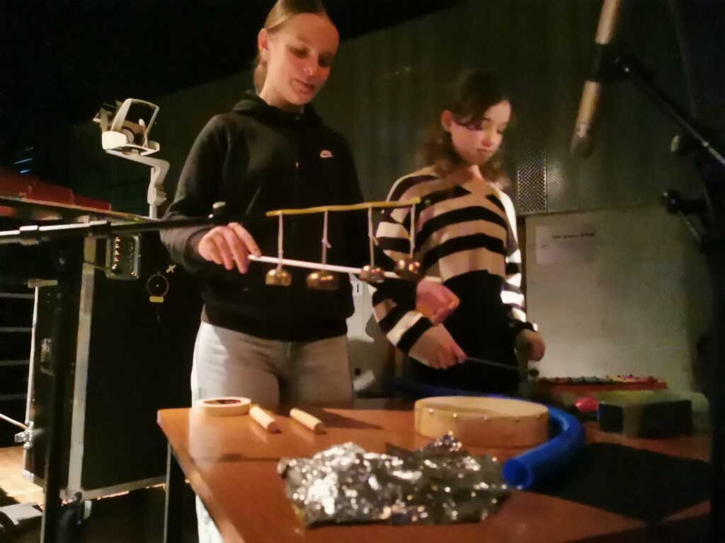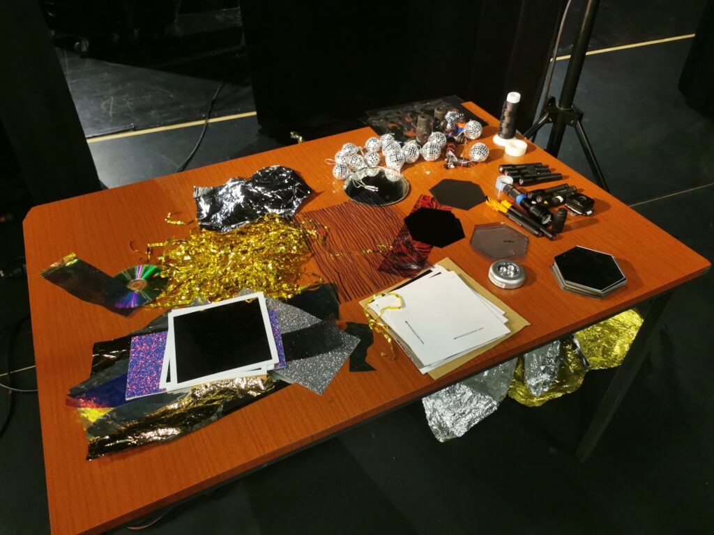 Nous proposons au public d’être immergé dans le dispositif – entre la fabrique à son et image et l’écran marionnette – et de pouvoir regarder le spectacle depuis plusieurs points de vue, sans devant ni derrière (sièges sans directions, miroirs rétroviseurs, mise en scène de la «fabrique à sons et à images»…).